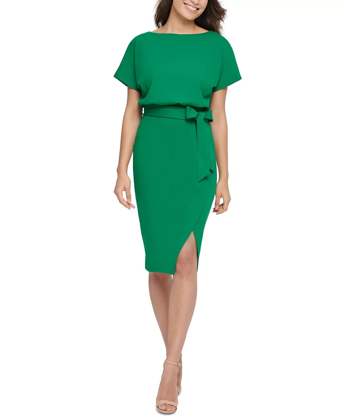 Vestido cruzado tipo blusón con cinturón y manga corta en forma de A de Kensie, verde