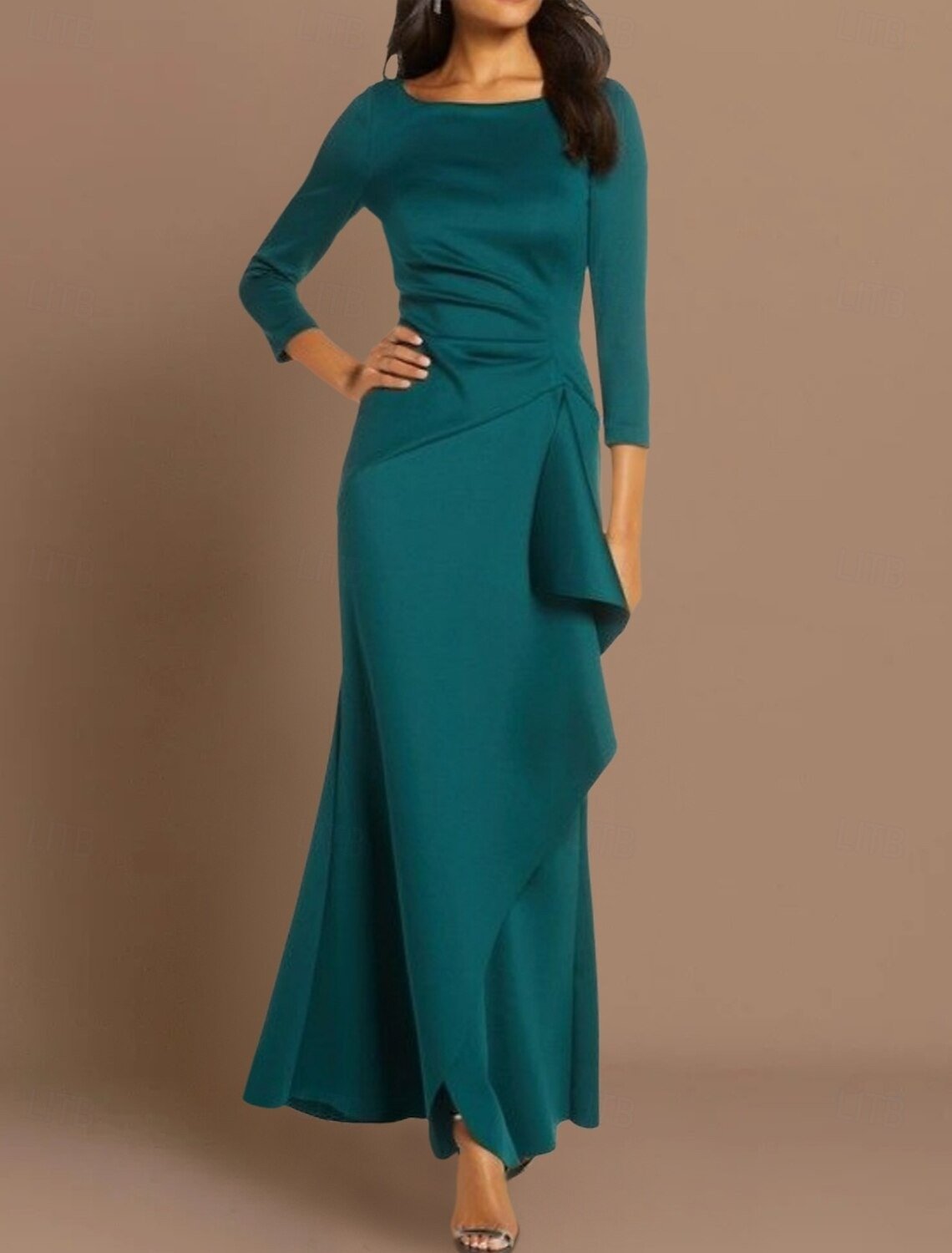 [Características destacadas del diseño]: Con un clásico escote redondo y mangas tres cuartos, el vestido está adornado con elegantes volantes que le aportan un toque de estilo. Incorpora un detalle drapeado asimétrico en la cintura, que crea una silueta favorecedora, y un discreto cierre de cremallera en la espalda garantiza un ajuste perfecto.