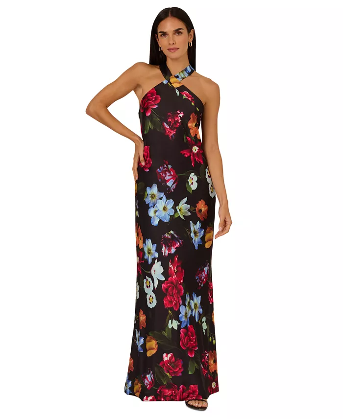 Un campo de flores florece en este precioso vestido de Adrianna by Adrianna Papell, un elegante diseño halter acentuado con un pañuelo incorporado que se puede atar o dejar suelto.